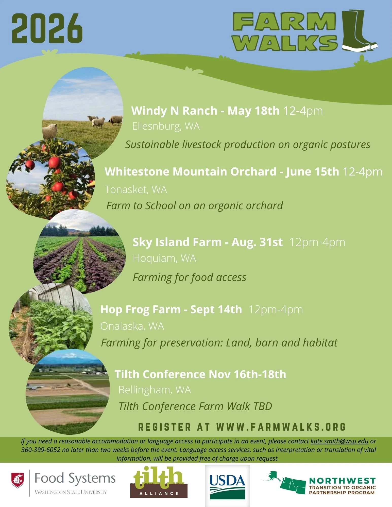 If you need a reasonable accommodation or language access to participate in an event, please contact Kate Smith, WSU Food Systems Program, at kate.smith@wsu.edu or 360-399-6052 no later than two weeks before the event. Language access services, such as interpretation or translation of vital information, will be provided free of charge to limited English proficient individuals upon request.